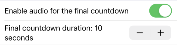 Final Countdown SettingsApp can be configured to make the ticking audio for the entire duration or just for a few seconds towards the tail end. Audio can also be completely overridden. |